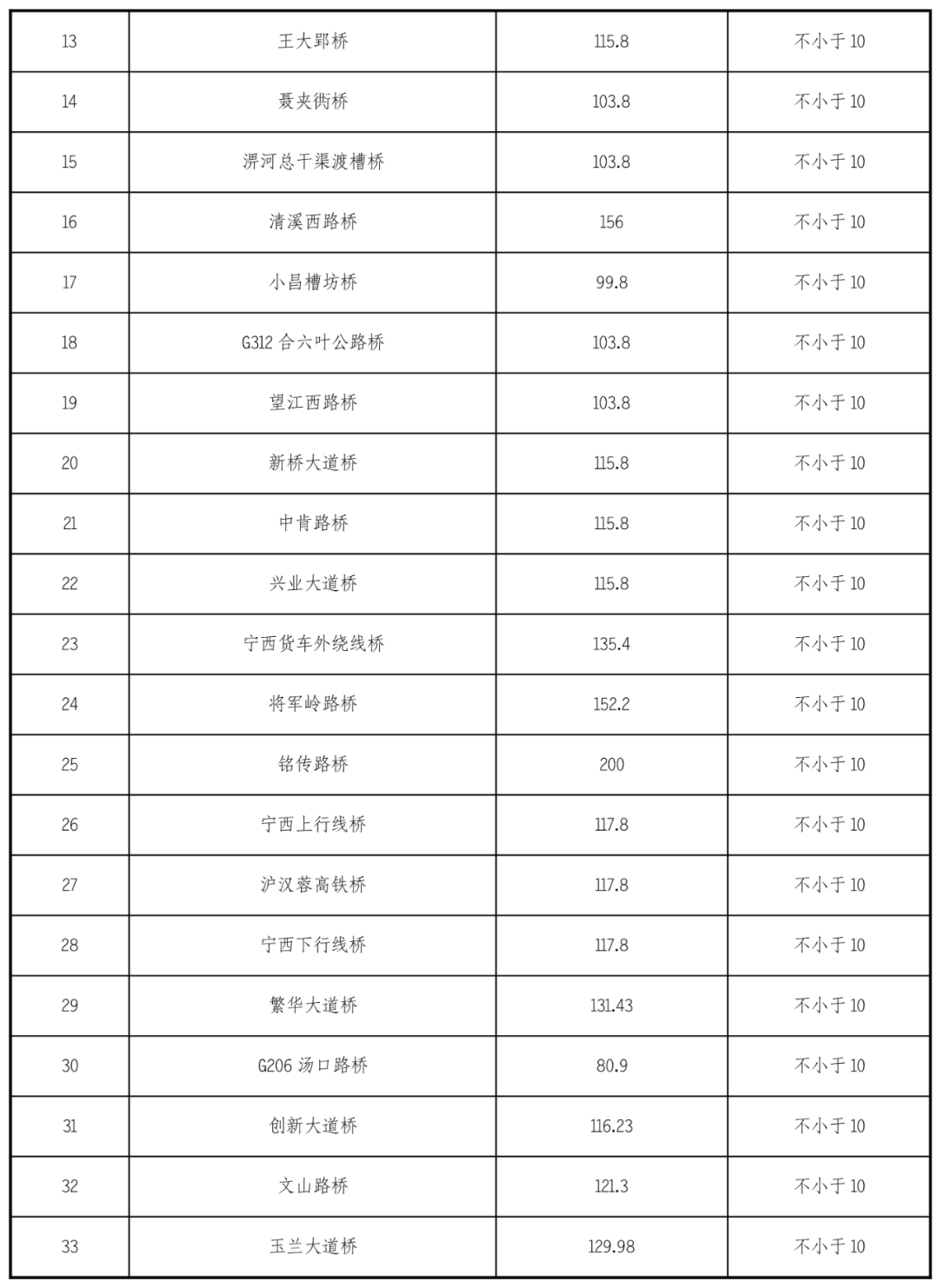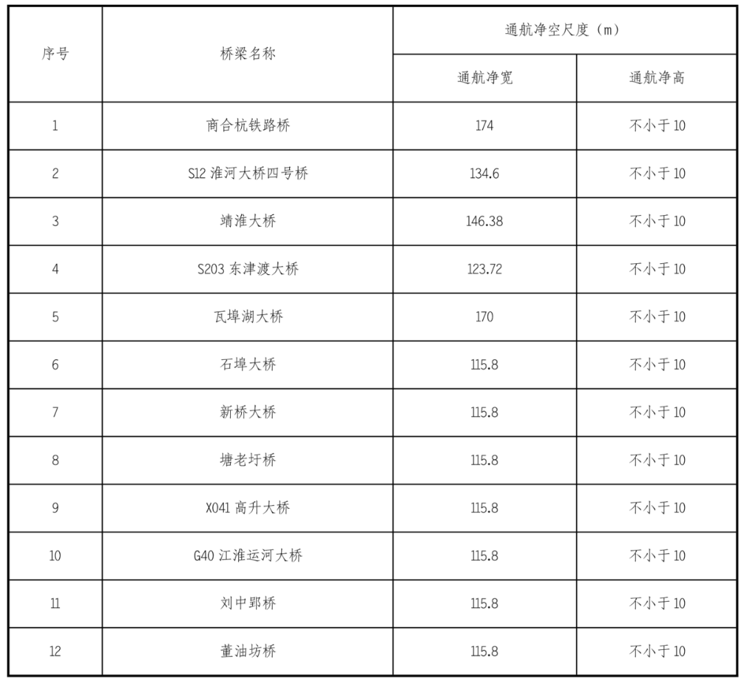 江淮溝通段航道沿線有現(xiàn)狀橋梁45座,橋梁通航凈空尺度參數(shù)見下表: