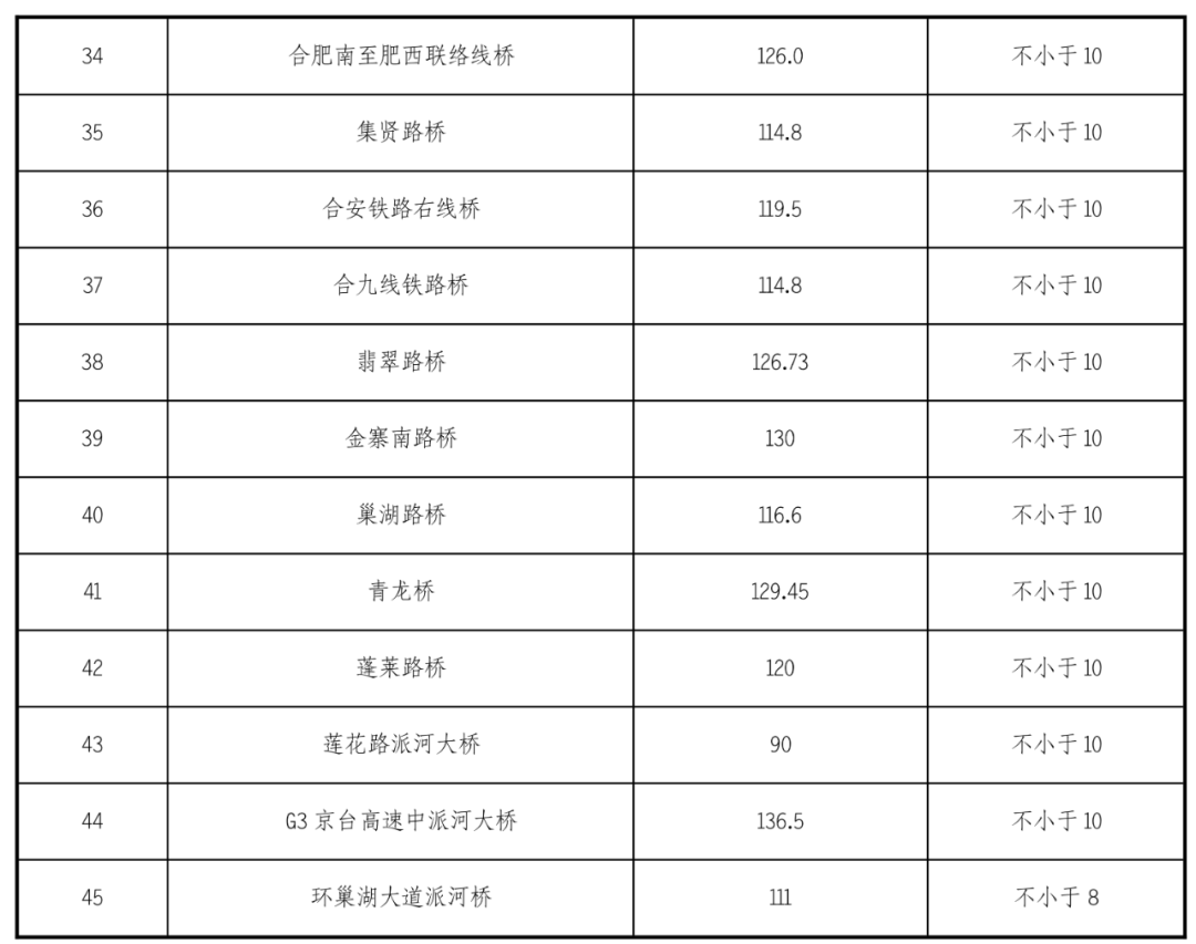 江淮溝通段航道沿線有現(xiàn)狀橋梁45座,橋梁通航凈空尺度參數(shù)見下表: